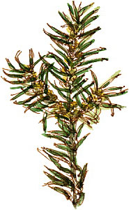 Female flowers are less conspicuous and are solitary, borne at the end of the stems. They produce berry-like fruits each with a single poisonous seed surrounded by a bright red fleshy cup, the aril.