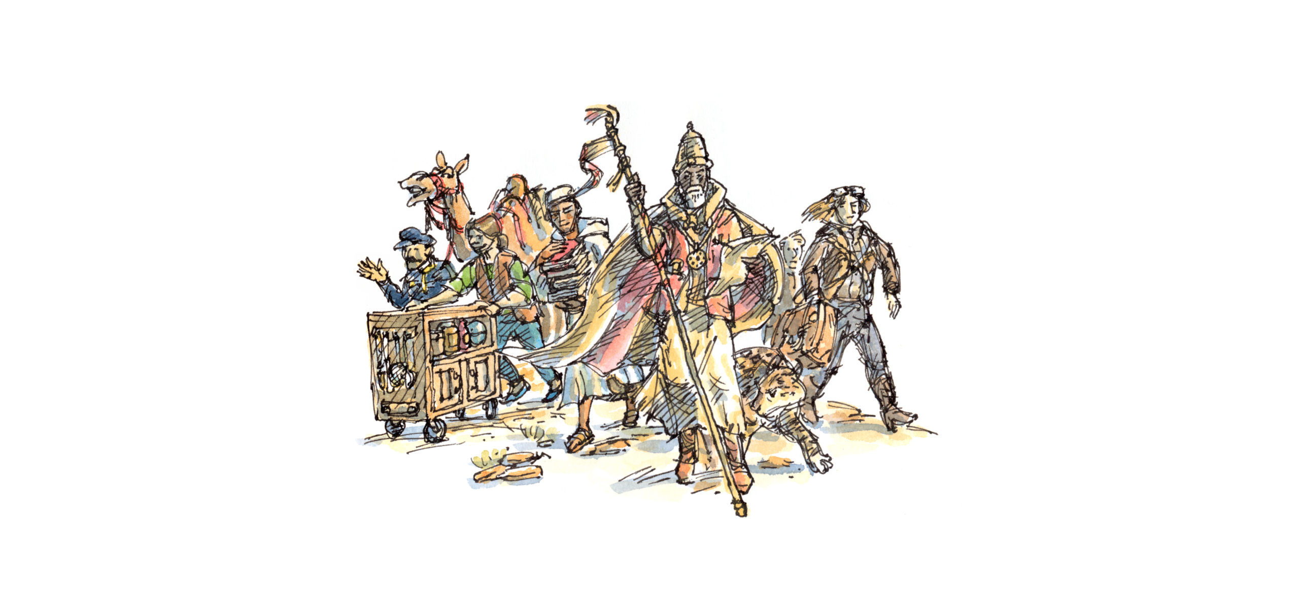 For the characters that might inhabit this desert base, I was thinking of an opera, perhaps a Philip Glass production, but inevitably in setting it in the 1930s or 40s I’ve ended up with Indiana Jones stereotypes. Although the zookeeper with the camel, if drawn in Hergé’s ligne claire style, could have a walk-on role in a Tintin adventure.