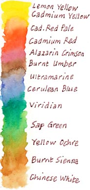 I decided to go with the selection of eight that comes with the box – scarlet lake, permanent rose, Winsor lemon, Winsor green (blue shade), French ultramarine, yellow ochre, burnt sienna and ivory black – removing the tiny brush from the central section to add four extras; cadmium yellow, permanent sap green, cerulean blue and raw umber.